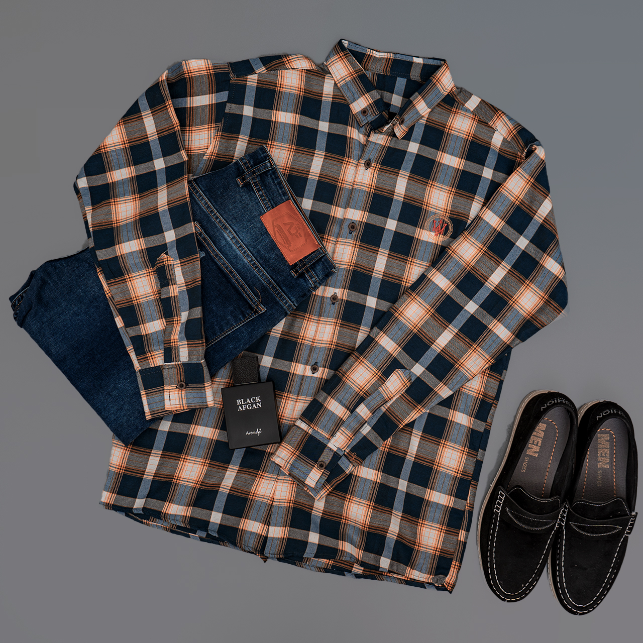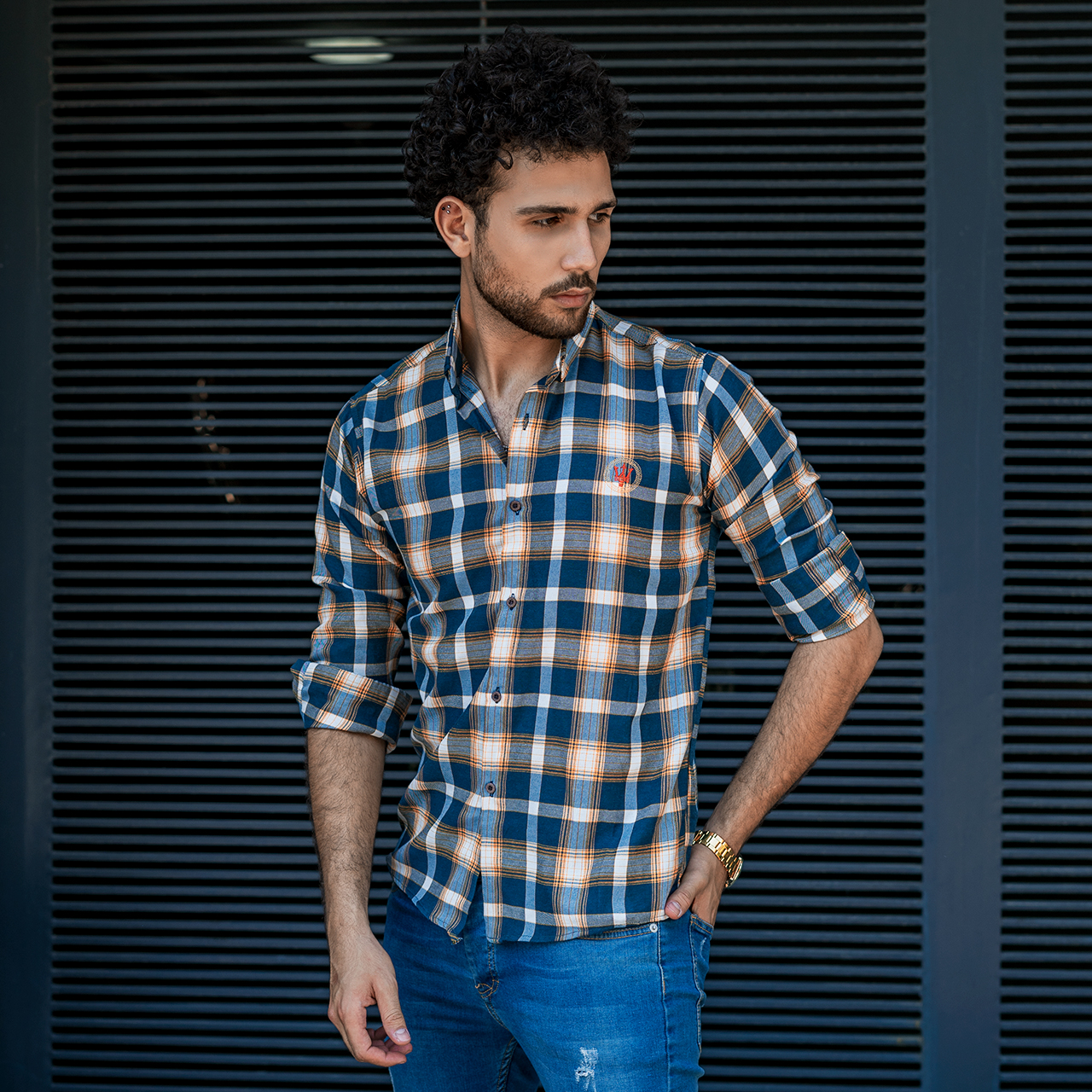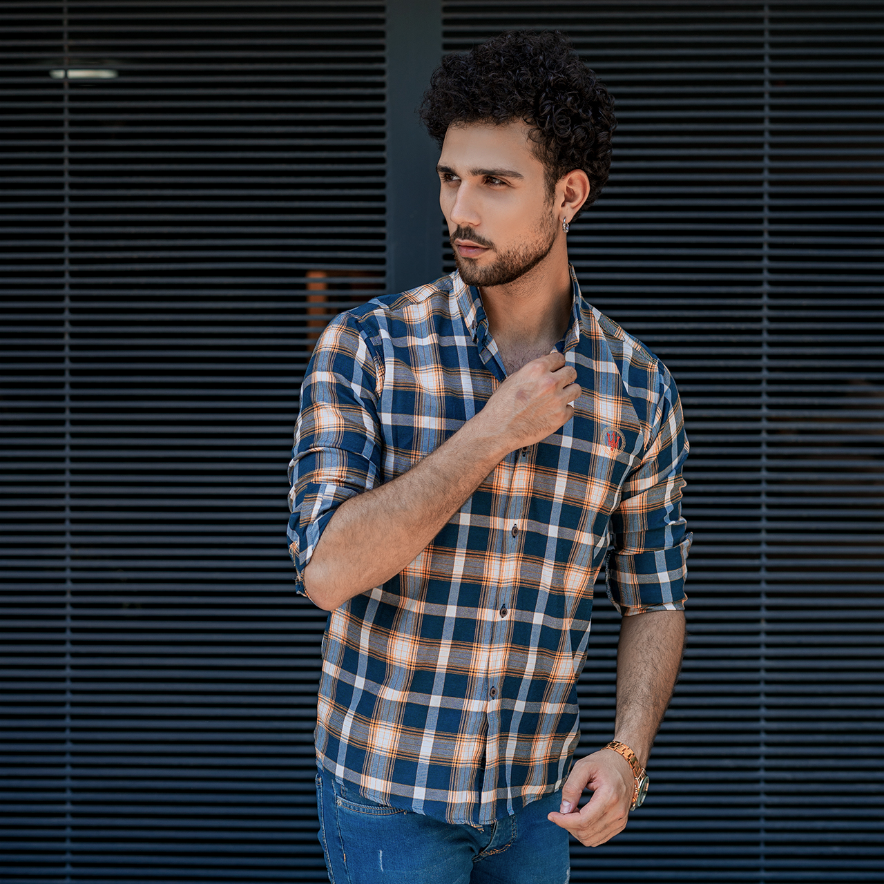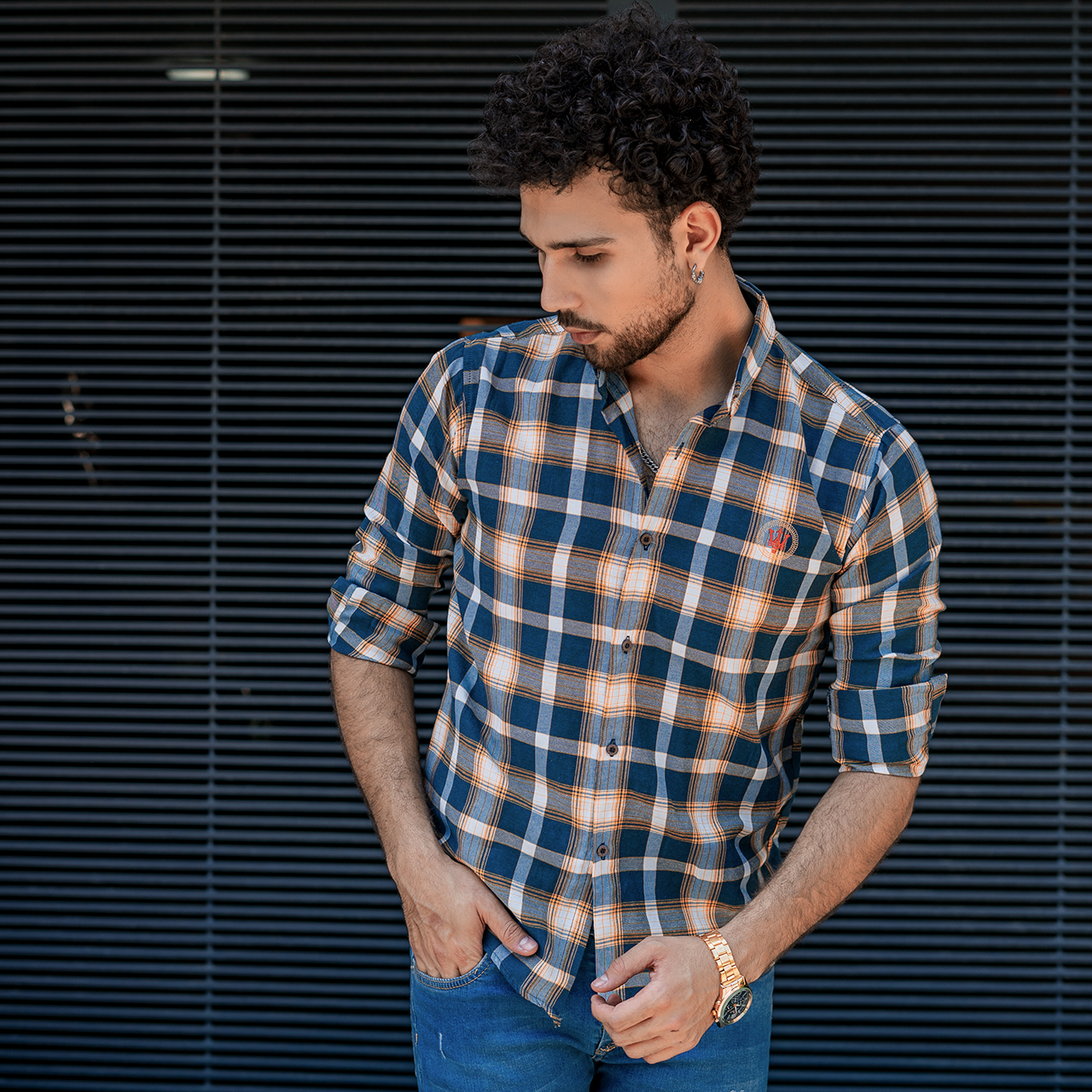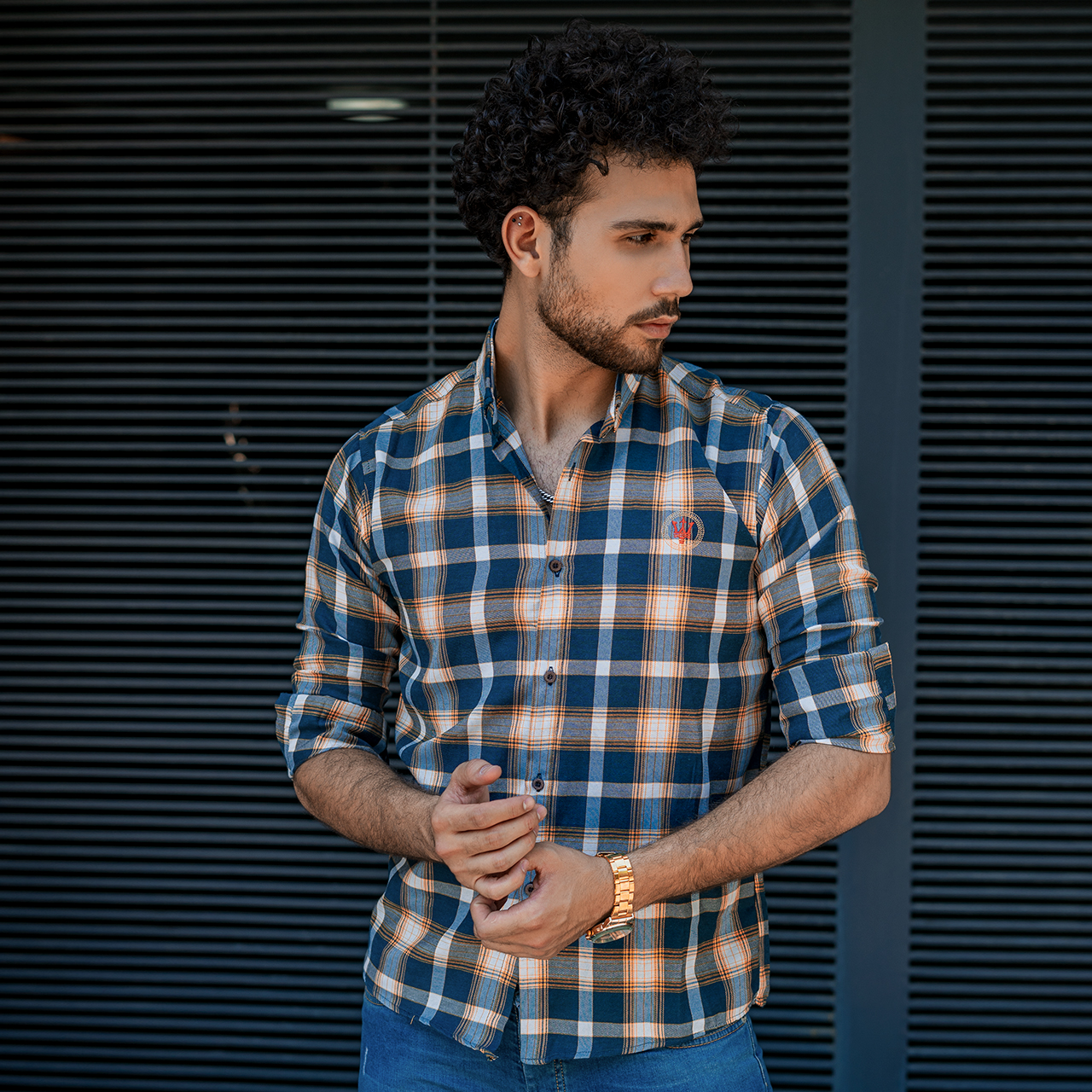 پیراهن چهارخونه مردانه آبی طوسی مدلB12